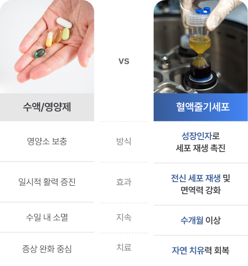 답변일반 영양 수액은 비타민과 미네랄 등 영양소 보충이 목적입니다. 반면 혈액줄기세포(GFC) 치료는 고농축 성장인자를 직접 공급하여 손상된 세포의 재생을 촉진하고 면역 시스템을 활성화합니다. 일시적인 보충이 아닌 근본적인 회복력을 높인다는 점에서 차이가 있습니다.