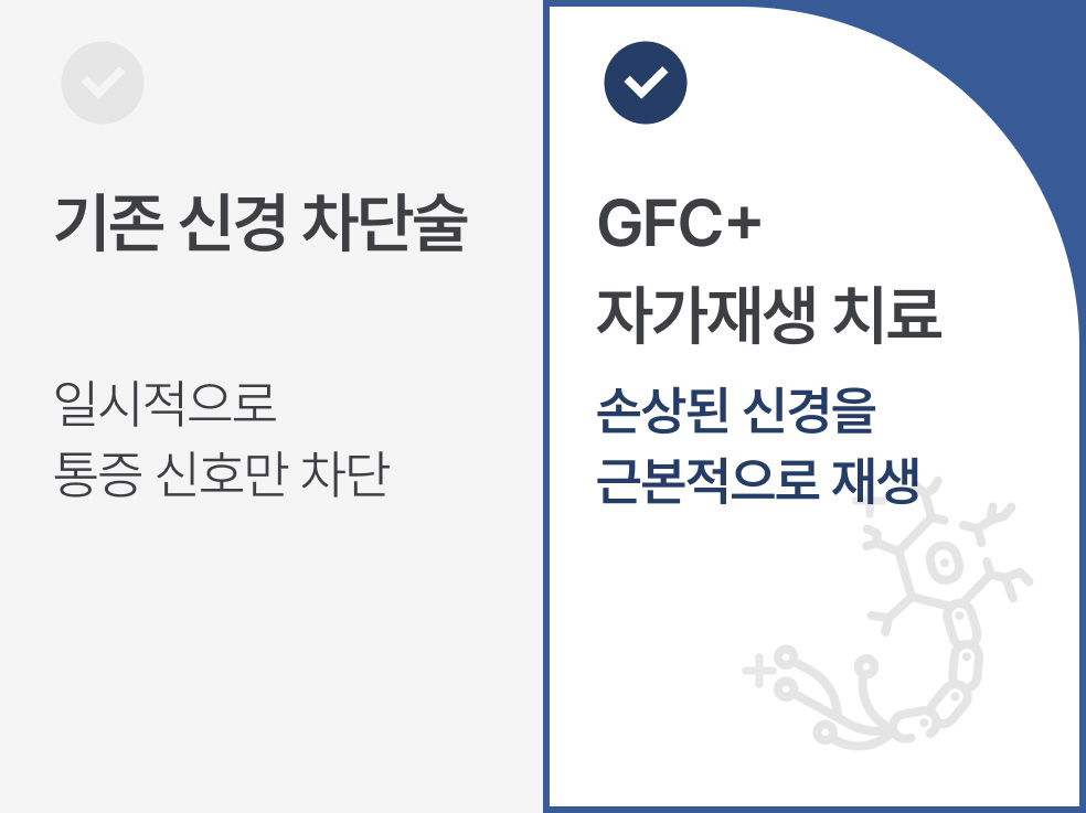 답변일반 신경 차단술은 당장의 통증을 빠르게 가라앉히는 데 중점을 두는 경우가 많습니다. GFC+ 자가재생 치료는 통증 완화와 더불어, 손상된 신경을 직접 재생시켜 근본적인 개선을 목표로 한다는 점에서 차이가 있습니다. 차단이 아닌 재생의 개념입니다.